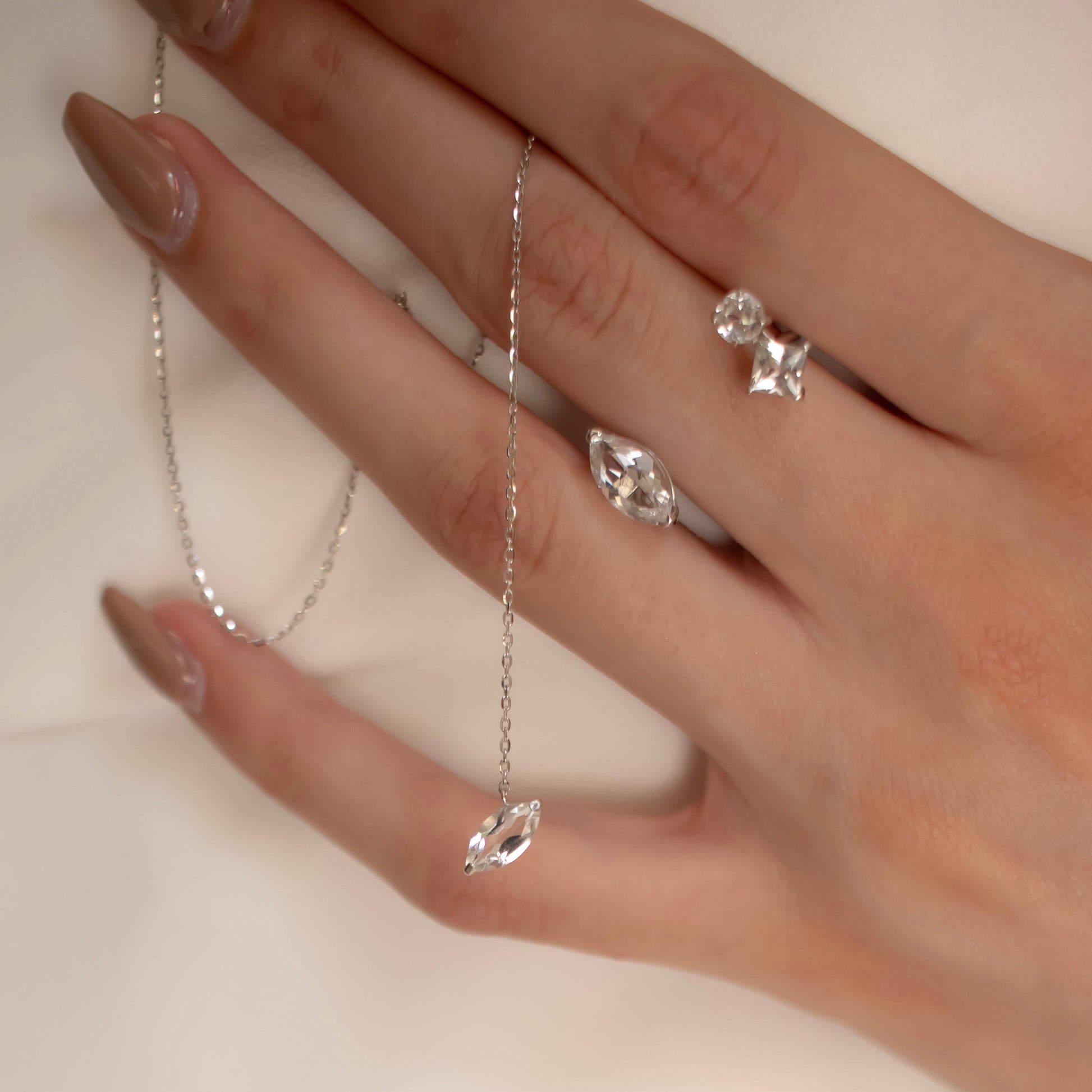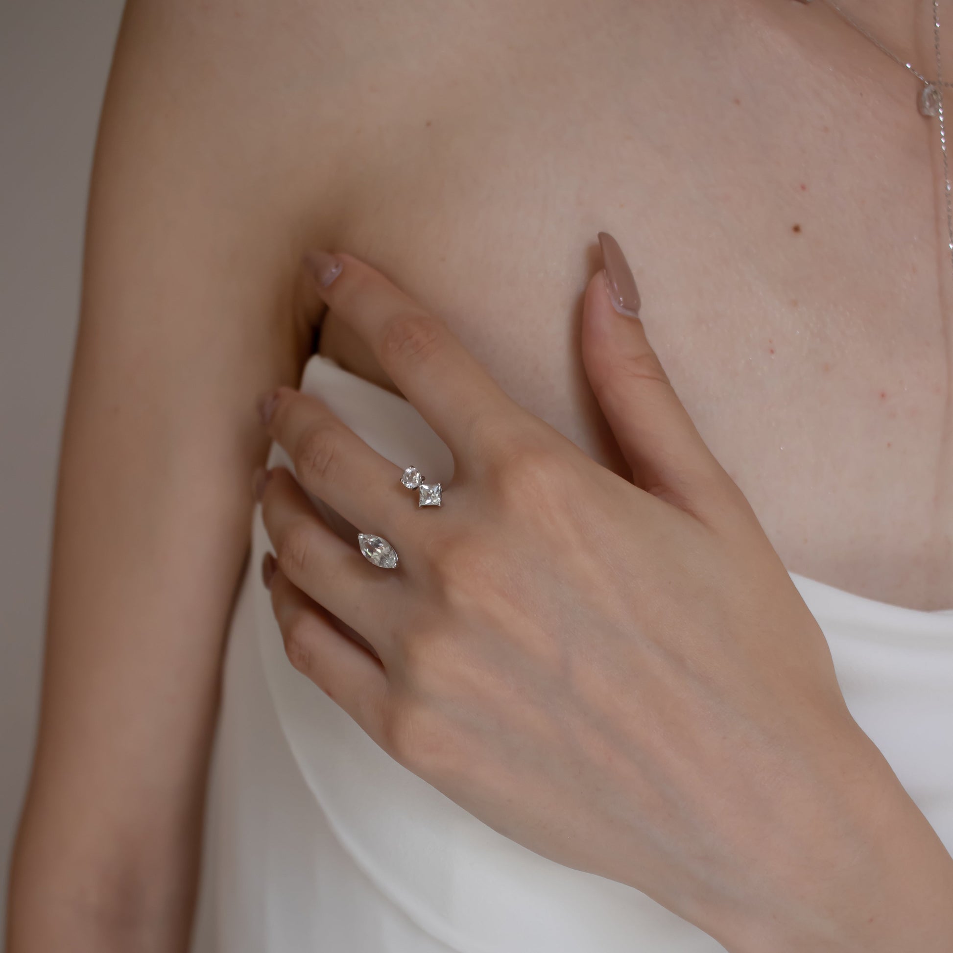 繊細な三つの雫が、そっと指に寄り添うリング。朝露がきらめく瞬間を閉じ込めたように、儚くも美しく輝きます。